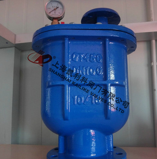 當管內開始注水時,塞頭停留在開啟位置,進行大量排氣,當空氣排完時,閥內積水浮球被浮起,傳動塞頭至關閉位置,停止大量排氣;當管內水正常輸送時,如有少量空氣聚集在閥內到相當程度,閥內水位下降,浮球隨之下降,此時空氣則由小孔排出。當抽水機停止,管內水流空時,或遇管內產生負壓時,此時塞頭開啟,吸入空氣確保管線安全。